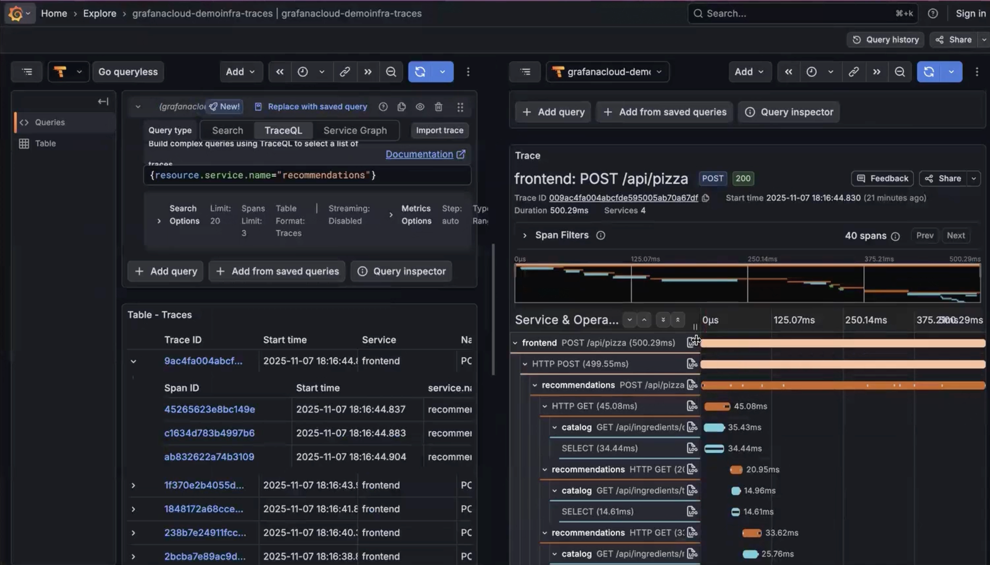 Everything is built on emerging industry standards (OpenTelemetry, OTLP, PromQL, LogQL) rather than proprietary agents and exporters. The components are interchangeable – swap Tempo for Jaeger, Loki for ElasticSearch – without rewriting application code.