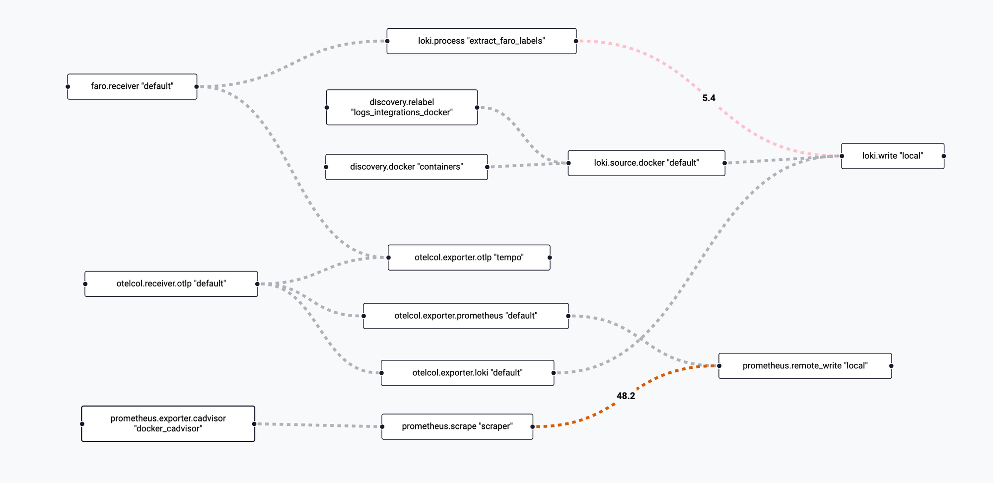 This stack doesn't stop at backend telemetry. Faro sends browser events, Web Vitals, errors, performance metrics, and navigation data to Alloy → Loki → Grafana.